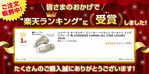 ) 有料ラッピング対応■商品詳細 ■ブランド CONVERSE コンバース ■商品名/品番 CANVAS ALL STAR COLORS OX/HI キャンバスオールスター カラーズ オックス/ハイ ■カラー ベージュ(黄土色) ■取扱いサイズ 3.0/3.5/4.0/4.5/5.0/5.5/6.5/7.0/7.5/8.0/8.5/9.0/9.5/22.0cm/22.5cm/23.0cm/ 23.5cm/24.0cm/24.5cm/25.0cm/25.5cm/26.0cm/26.5cm/27.0cm/27.5cm/28.0cm ■素材 《アッパー》キャンバス 《アウトソール》ラバー ■ワイズ(横幅) 細身の1E相当 ■靴の詳細(8.0[26.5cm]採寸) 《ソール高》接地面より約 1.5 cm 《履き口までの高さ》OX:約 8.0 cm/HI:約 14.0 cm(ソール部分も含む) 《履き口周り》紐で調節出来ます 《重量》OX:片足 約 369 g/HI:片足 約 374 g ■サイズについて 普通のALLSTARと同じラスト(靴型)なので、やや幅が細めです。