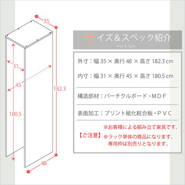 商品詳細 サイズ 外寸:幅35cm×奥45cm×高さ182.3cm 内寸:幅31cm×奥行き45cm×高さ180.5cm 材質 パーチクルボード、中密度繊維板(MDF)、プリント紙化粧合板、PVC カラー ダークブラウン ホワイト ナチュラル 梱包サイズ 約193x51.5x8cm(18kg) 組み立て お客様組立品です 出荷 翌営業日〜5営業日後の出荷 ポイント すき間収納ラック【GaP】別売りの専用枠(2杯用)。